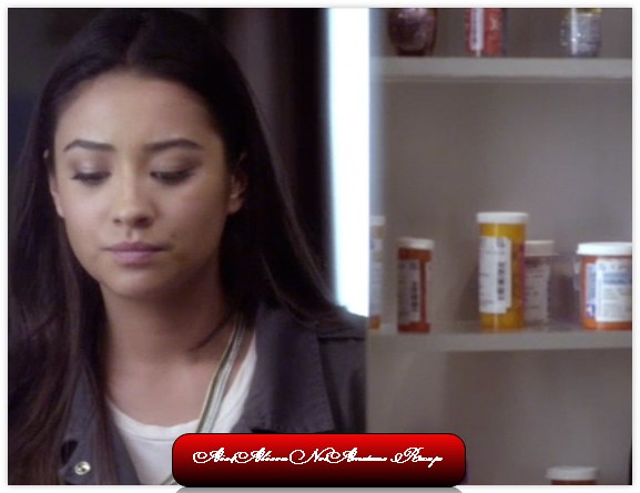 and a toothbrush. So Ashley tried to clean her really good shoes off with a toothbrush?! And they're HIGH HEELS?! Hmm interesting indeed. As for Emily, she's taking pills to ease the pain of her shoulder, which in true PLL style we can all expect something very bad to happen. Nobody on PLL takes pills and suffers consequences. Sorry, but not happening. Emily decides to be even more fucking STUPID and takes even more pills for the road. What a fucking dumbass. You think when A sabotaged her medicine back in season 1 she'd learn. Stupid idiot.