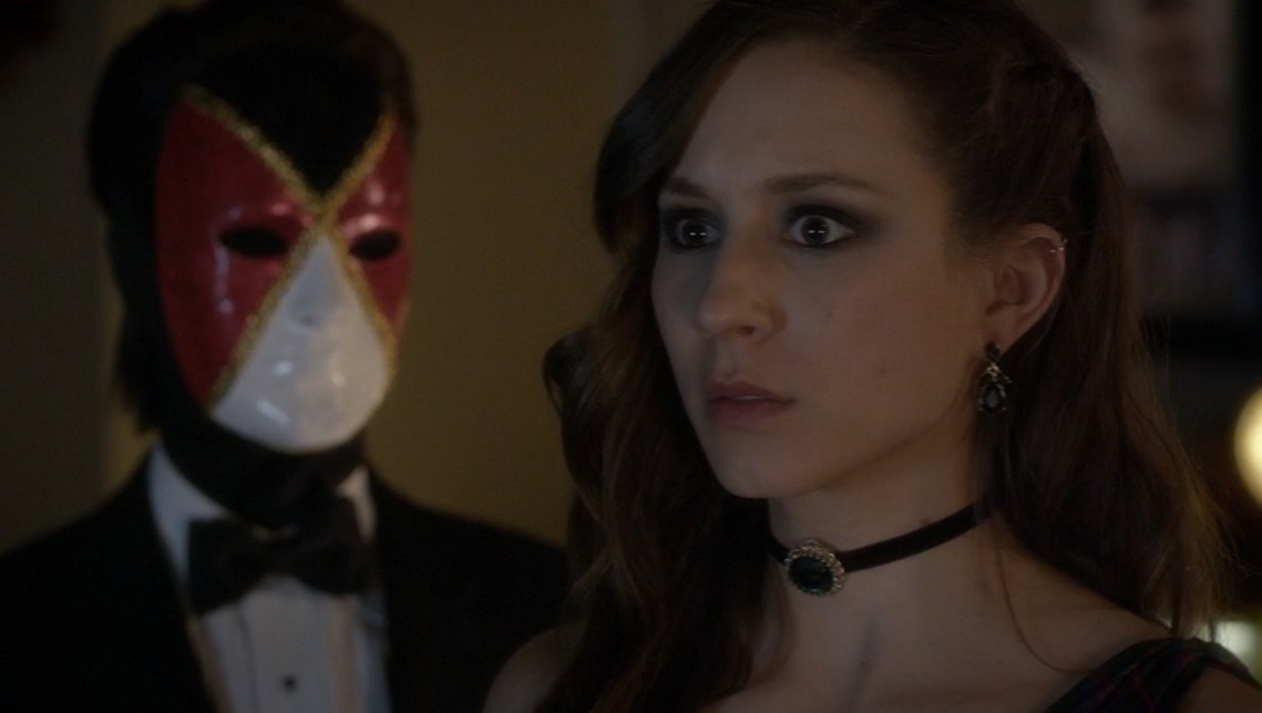 The most CREEPIEST PROM EVER! and has all these mannequins with Phantom masks and we all know he's somewhere around there, right? After the lights turn on, the Liar's walks down the steps and they're looking around knowing they are not alone. As the camera zooms all over the place, they reveal that Charles is there!! And I will admit, his mask looks really fucking cool to honest! When the scene comes back, Mona appears in the Alison mask and the voice announces Alison DiLaurentis as Prom Queen. That's when the plan goes into motion and the Liar's begins to coax Charles into revealing himself so he can be Prom King. When Charles walks out into the open, Aria is holding the camera but Spencer is like, “Don't do it too late, you fuck everything up Aria, don't fuck this up!”