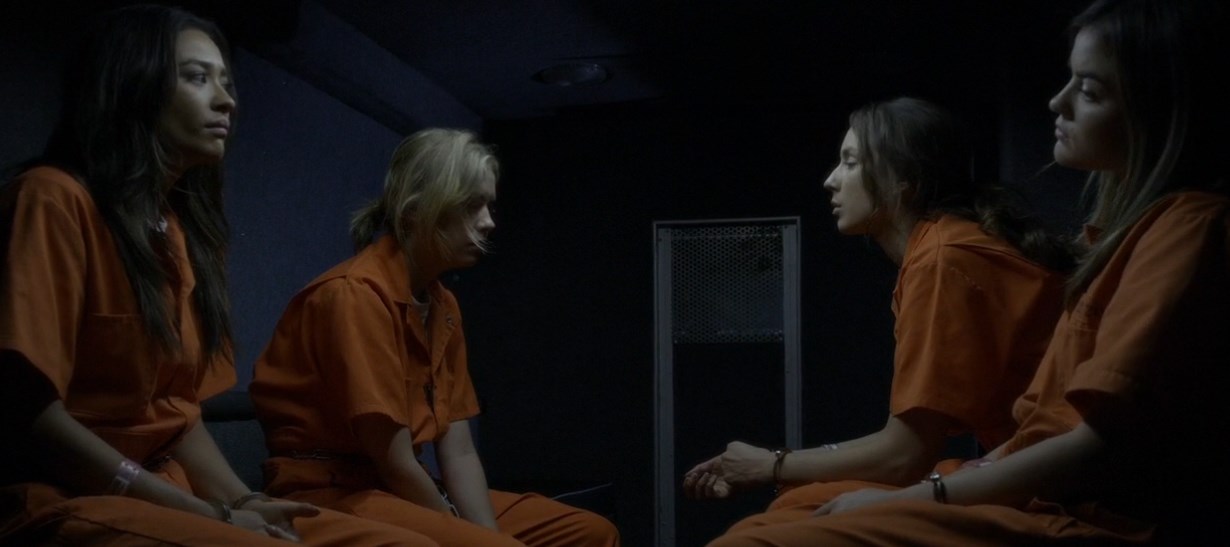 We see the Pretty Little Liar's sitting in a police vehicle being taken to a completely different jail than Alison. Hanna feels pissed the fuck off because they're going to jail for the murder of Mona Vanderwaal, even though they were technically charged as accessories. Aria mentions something about a Chain-Gain, but everything still stands. The poor little girl's are going to jail. Hanna explains to the others the process of being put in jail...or at least what jail feels like. Apparently, Cha... I mean, -A sent in an anonymous tip which Hanna