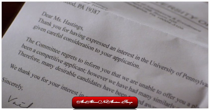 So as the scenes change, we're at Spencers who just received an application from UPENN. I remember way back when she applied to this school. Through CeCe. Through a guy. A random guy. A guy we never ever fucking saw on screen. By the way, where the FUCK IS CeCe?! The last we saw her she was running off to Nowhere Land with her article of red clothing that got everyone in a tizzy. Sighs. Moving on. Spencer opens the letter and then...and then....SHE...(Refer to Picture for answer) Naahh JK! SHE TOTALLY GOT DENIED!!! Seriously did she expect to actually get in? I mean this is fucking CeCe we're talking about here. Like come on!! Spencer looks shocked as fuck, but I really don't get why. Unless I got schools mixed up and it wasn't the one she got CeCe to help her with. Can someone confirm this?? I don't feel like going back to look. *scratches neck*.